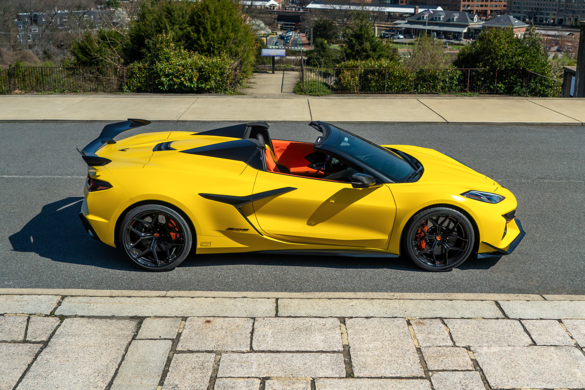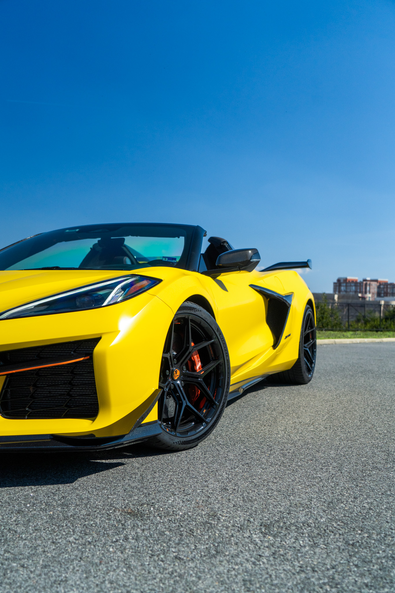 This Competition yellow Corvette C8 Z06 HTC takes that already aggressive platform and refines it with a clean and purposeful wheel setup. Sitting on Forgelite forged magnesium MG01 wheels in a Gloss Obsidian Black finish, the car gains a sharper and more focused presence. The deep black finish contrasts strongly with the bright yellow body, creating a bold yet balanced look that highlights the car’s wide stance and sculpted lines. Magnesium construction brings another level of performance to the setup, reducing unsprung weight and improving overall responsiveness, something that directly complements the Z06’s high-revving nature. The MG01 design is built around maximum performance, strength, and weight reduction. As a forged magnesium monoblock wheel, it offers significant weight savings compared to traditional aluminum wheels, they save over 30lbs compared to the factory aluminum wheels, making it an ideal choice for a track-capable car like the C8 Z06. The clean and functional spoke layout keeps the design sharp and purposeful, aligning with the aggressive styling of the Corvette. On this build, the fitment is dialed in precisely, sitting flush with the fenders to create a wider and more planted stance. This is where Custom Wheels for C8 Corvette make a real difference—enhancing both the performance and the visual impact of the car.